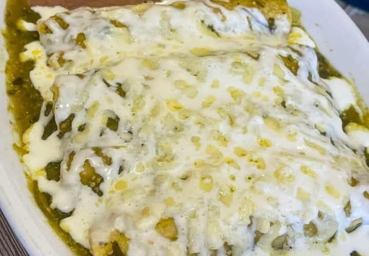 Enchiladas suizas is a popular Mexican dish made of corn tortillas stuffed with shredded chicken that are topped with a creamy green sauce and cheese, and then baked until bubbling and melted. The name comes from the Spanish word “suiza”, which means “Swiss.” This enchilada variation was first created at a Mexico City department store café in the 1950s. These Swiss-style enchiladas get their name from the inclusion of cream and cheese.