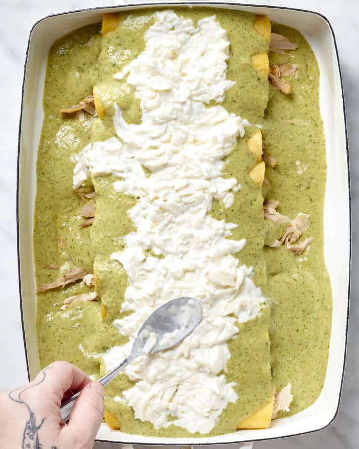 • Add cheese over the top. Dollop a mixture of shredded Oaxaca cheese and Mexican crema over the saucy enchiladas.