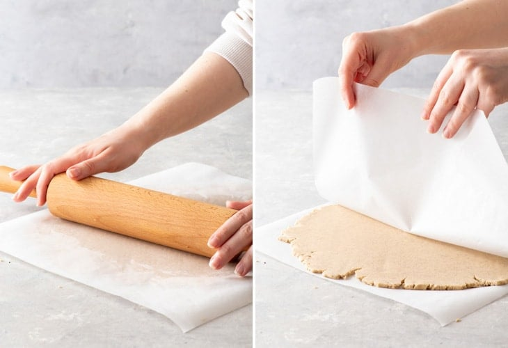 - Roll out the cookie dough between two sheets of baking/greaseproof paper to a thickness of about 5mm.Tip: Rolling out cookie dough between two sheets of baking/greaseproof/parchment paper prevents it from cracking during rolling. It also eliminates the need for dusting your work surface with extra flour, as you don’t want to incorporate more flour into the cookie dough.