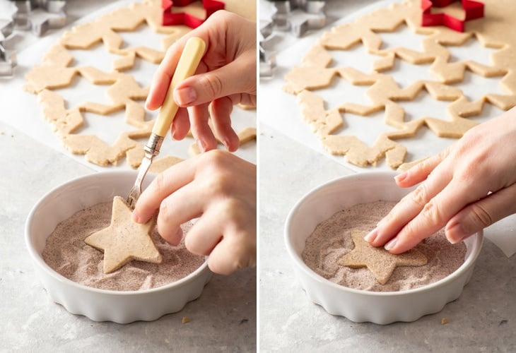 Then, press one side of the cookie into a mix of ground cinnamon and superfine/caster sugar. Flip it around and press the other side into cinnamon sugar as well (be gentle: the cookies are fairly delicate). Transfer to a lined baking sheet and repeat with the rest of the cookie dough (re-rolling the scraps as you go along until you use up all the cookie dough).