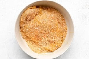 Eggs. Unfortunately, there isn’t a good swap for eggs here. They’re key to ensure the parmesan breadcrumb mixture sticks to the chicken.