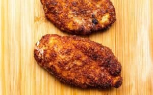 In another shallow bowl, add the breadcrumbs, spices, salt and pepper. Dunk each piece of chicken into the egg wash on both sides, then dip into the breadcrumbs on both sides.
